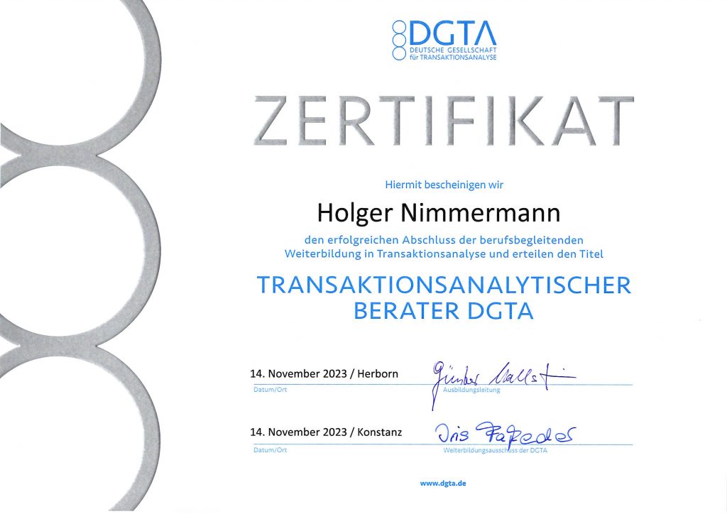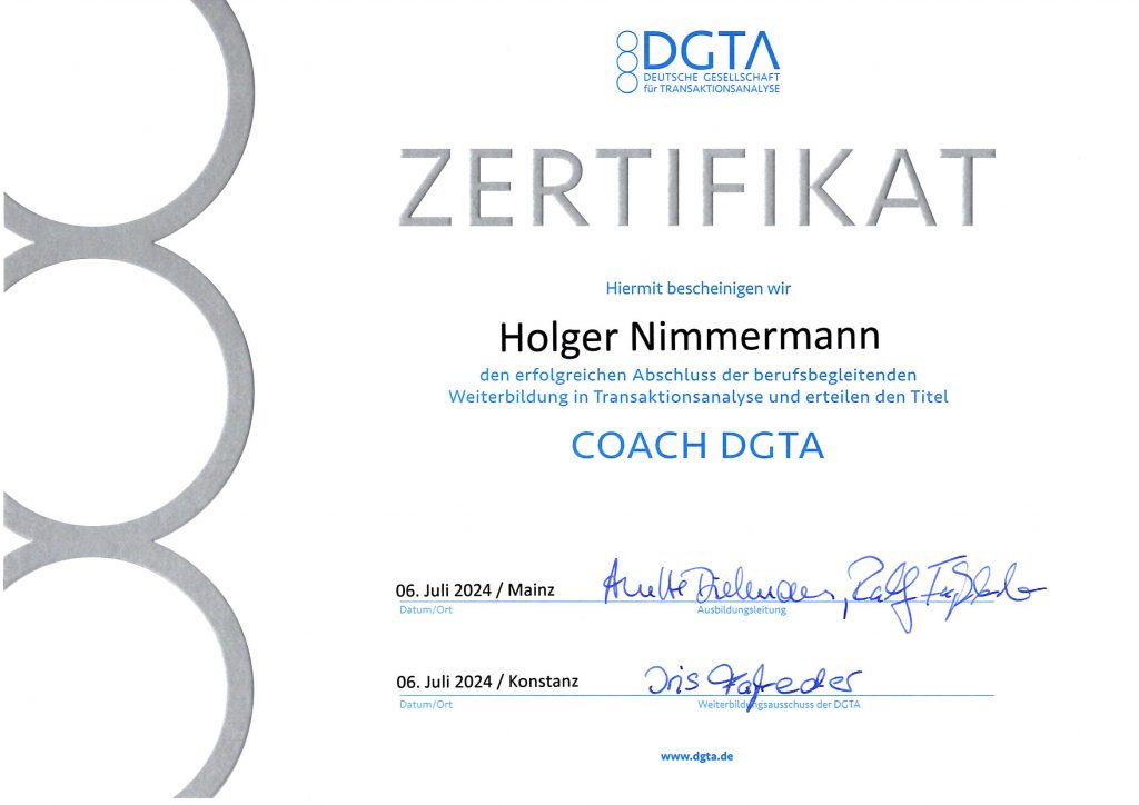 2023 habe ich meine Ausbildung zum transaktionsanalytischen Berater (zertifiziert durch die Deutsche Gesellschaft für Transaktionsanalyse DGTA) abgeschlossen und 2024 meine Qualifikation als DGTA-zertifizierter Coach erworben. Ich befinde mich weiterhin in supervisorischer und intervisorischer Begleitung, um mich als Berater und Coach weiterzuentwickeln.